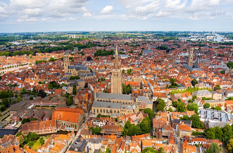 Брюгге, Бельгия Церковь Богоматери. Центр города. Жилые районы. Панорама на город. Летний день, облачная погода. Вид с воздуха