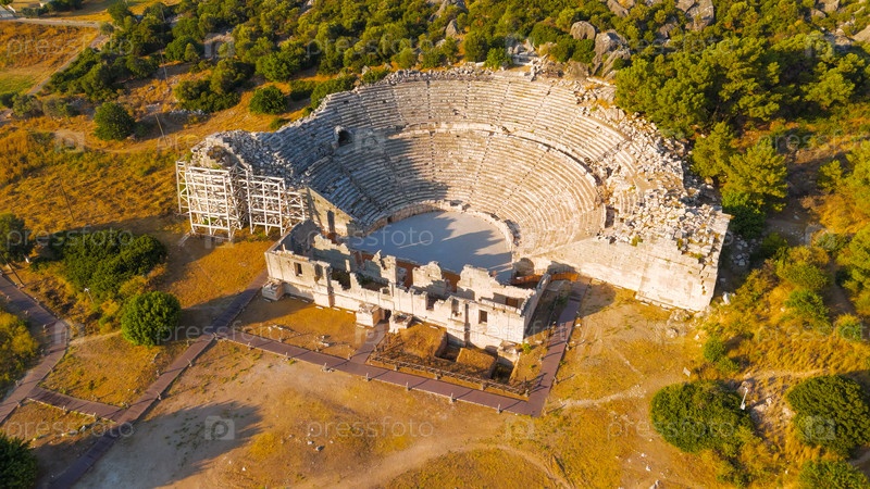 Гелемис, Турция.Древний театр Патара на склоне холма Курсунлу, древнее археологическое памятник в летнем утреннем свете, историческая достопримечательность Турции.Вид с воздуха