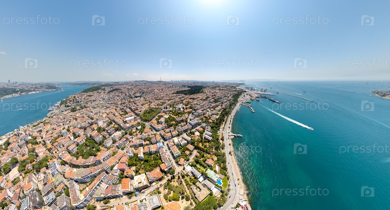 Стамбул, Турция.Порт Хайдарпаса на Босфоре при входе к Мраморному морю с районом Ускудар.Панорамный вид портовой инфраструктуры и городской зоны из воздуха летом днем.Вид с воздуха