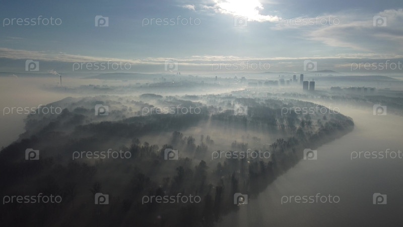 Полет беспилотника над Дунаем в утреннем смоге и тумане.Жемунский и Новый Белградский район, Белград, Сербия, Европа