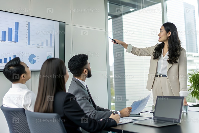 Молодая азиатская бизнес-лидерка представляет финансовые отчеты о продажах разнообразной команде коллег, указывая на большой экран