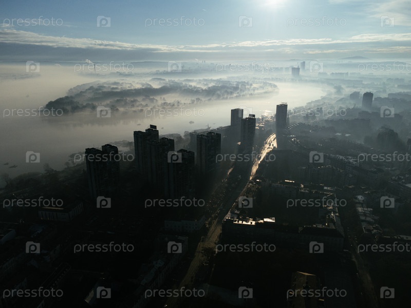 Вид из воздуха с беспилотного летательного аппарата города Белграда в смоге и тумане утром.Жемунский район и Новый Бельград, Сербия, Европа
