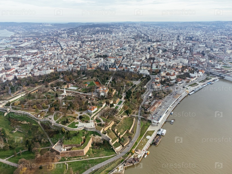 Вид с беспилотника: вид на город Белград сверху старой крепости Калемегдан, Сербия