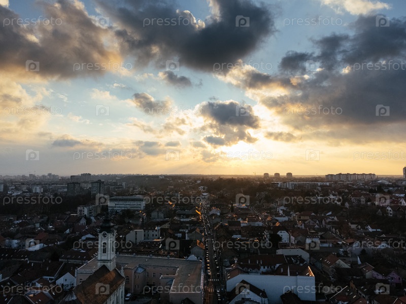 Полет беспилотника на закате над районом Земум, Белград, Сербия, Европа