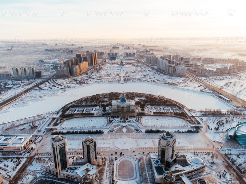 Вид с воздушного дрона Нур-Султан, Казахстан Центр города Казахстана с небоскребами и башней Байтерек
