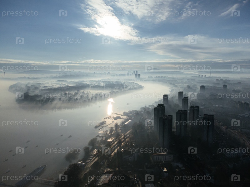 Полет беспилотника над рекой Дунай в смоге и тумане утром.Дистрикт Земун и Новый Белград, Белград, Сербия, Европа