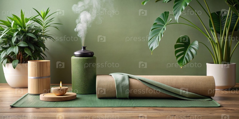 Зеленый йога-мат на деревянном полу с растениями и диффузором