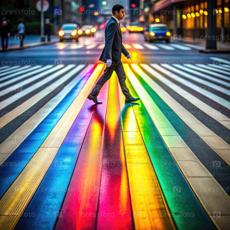Человек, идущий по красочному пешеходному переходу на городской улице в сумерках