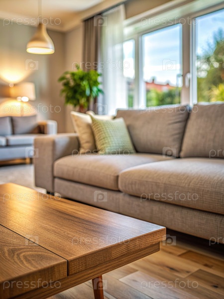 Деревянный кофейный стол в современной гостиной с бежевым диваном