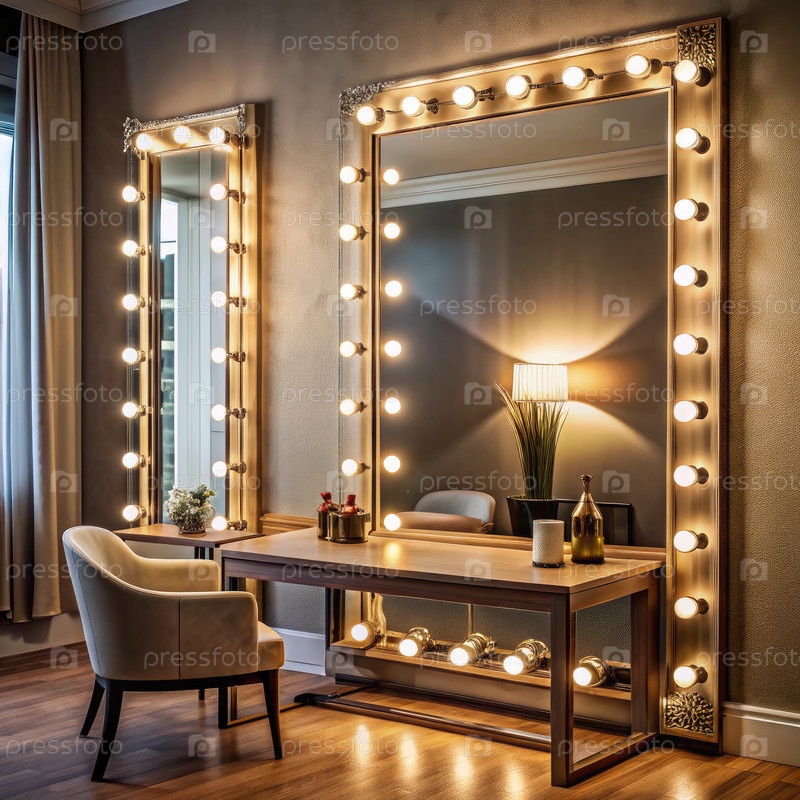 Область тщеславия со светящимися зеркалами и деревянным столом в хорошо освещенной комнате