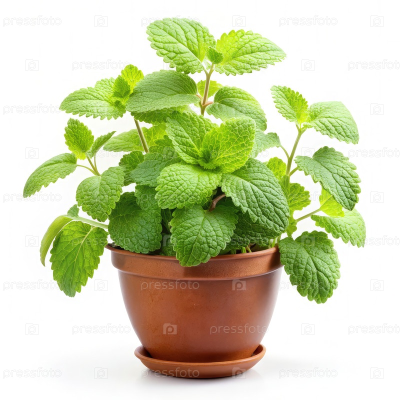 Растение лимонного бальзама в зеленом горшке на белом фоне