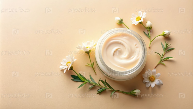 Натуральный кружок с кремом для лица, окруженный ромашками на бежевом фоне