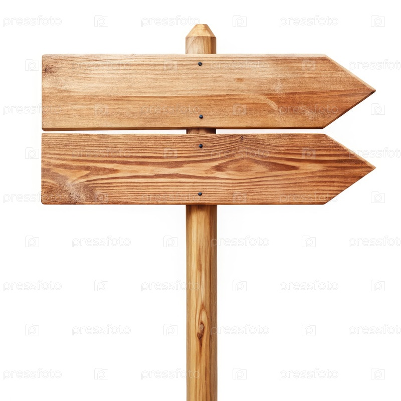 Пустой деревянный направляющий знак с двумя стрелками, изолированными на белом фоне