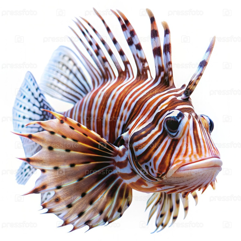 Реалистичная львиная рыбка с поразительными полосками плавает в чистой воде