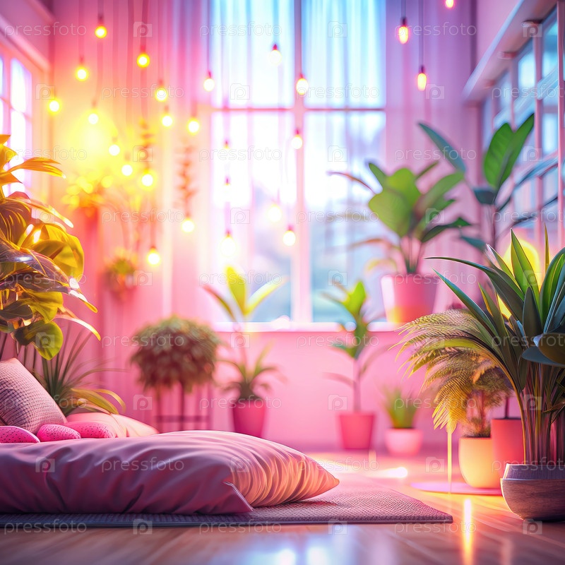 Розовая комната с растениями и струнными огнями. генеративный ИИ