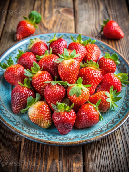 Зрелые красные клубники в синей тарелке на деревянном рустическом столе
