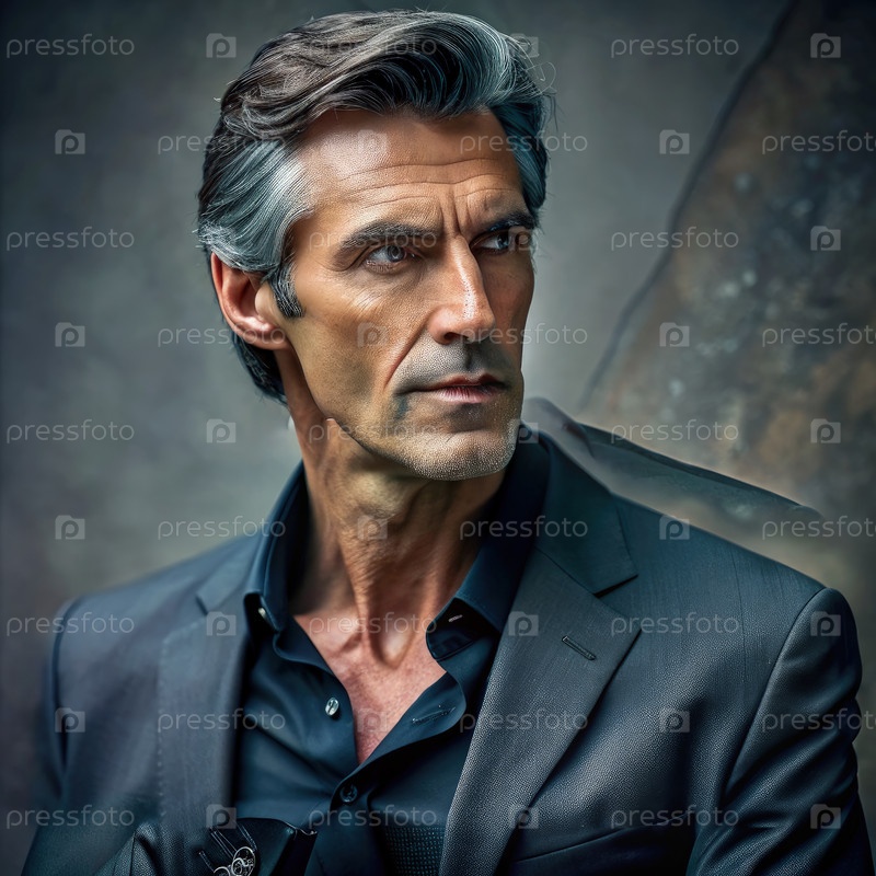 Портрет мужчины среднего возраста с седыми волосами, одетого в черную рубашку и куртку
