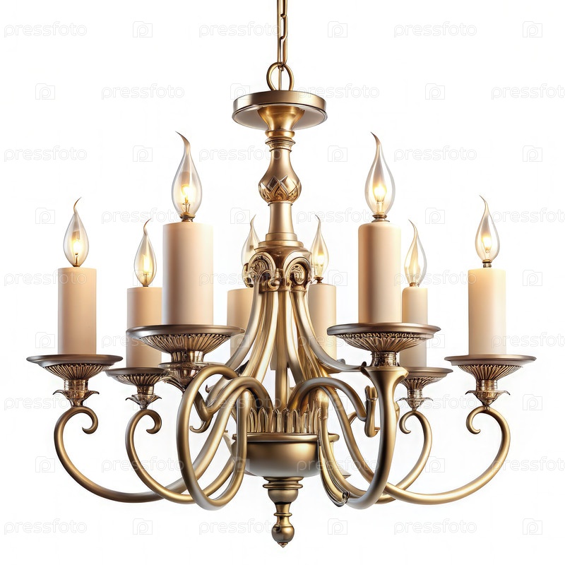 Украшенная латунистая люстра с лампочками в стиле свечей на белом фоне
