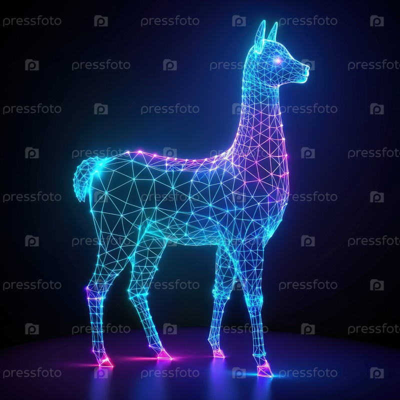 Неонная проволочная рамка Ллама ходит в темном цифровом пространстве. генеративный ИИ