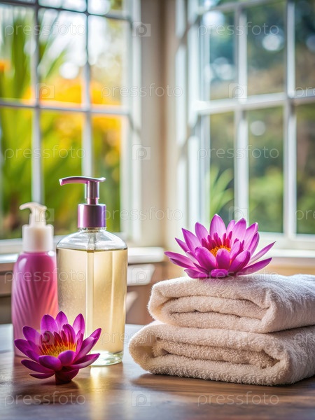 Заложенные белые полотенца с розовыми цветами и бутылки для мытья тела. генеративный ИИ