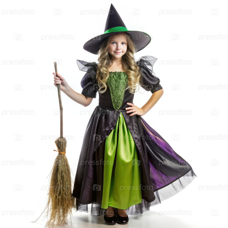Молодая девушка в костюме ведьмы держит метлу на белом фоне