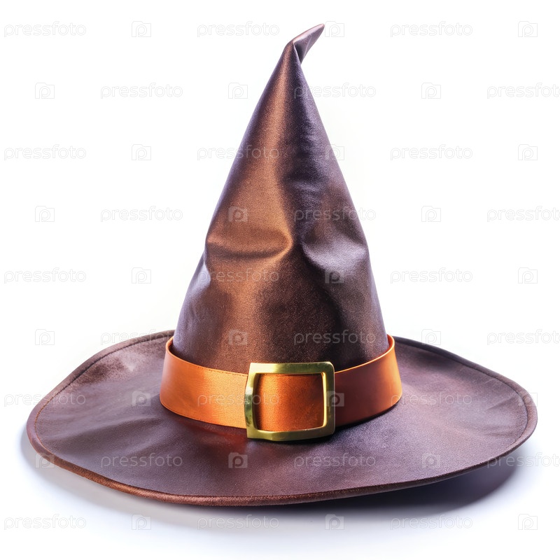 Коричневая колдовская шляпа с оранжевой полосой и золотым застежкой на белом фоне. генеративный ИИ
