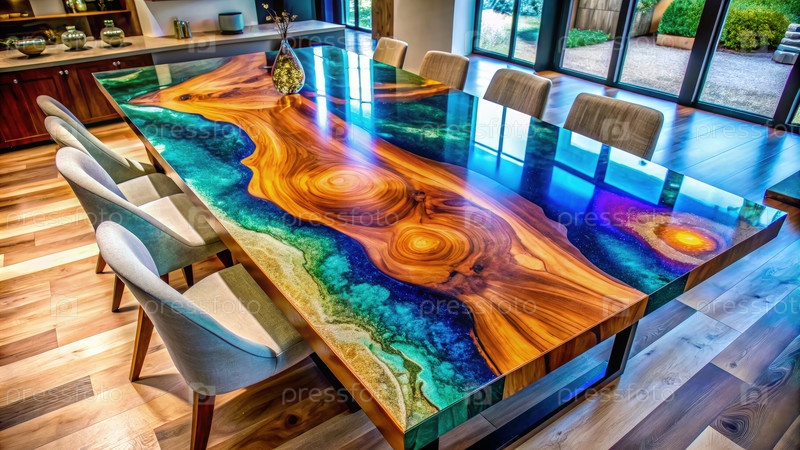 Потрясающий обеденный стол из смолы и дерева с голубыми, зелеными и золотыми оттенками