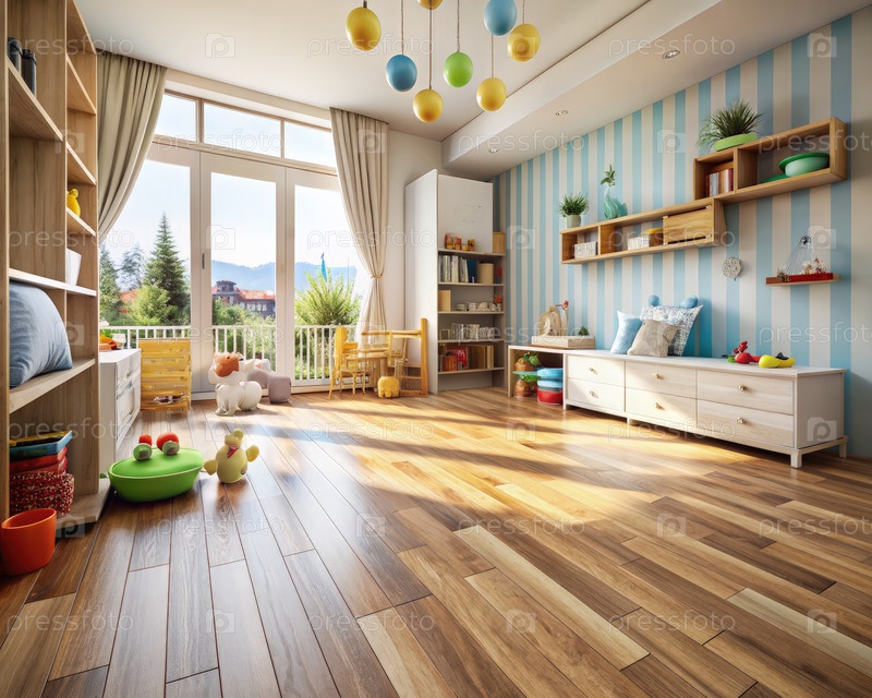 Солнечный день в хорошо освещенной детской игровой комнате с деревянным полом и большими окнами