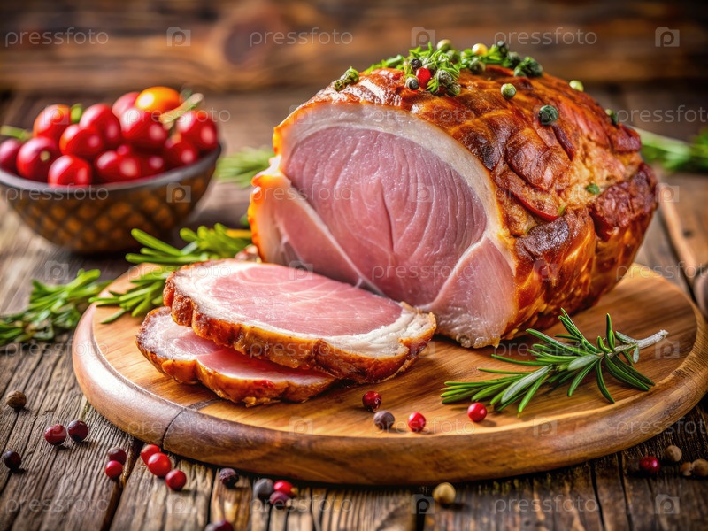 Жаренная ветчина с розмарином и перцем на деревянной доске для резки