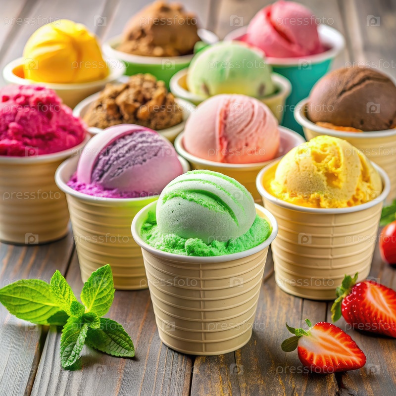 Красочные ложки мороженого в бумажных чашках на деревянном столе