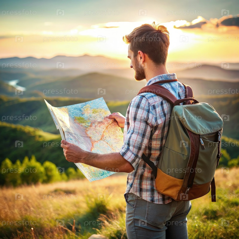 Рыбак, изучающий карту в горной долине на закате