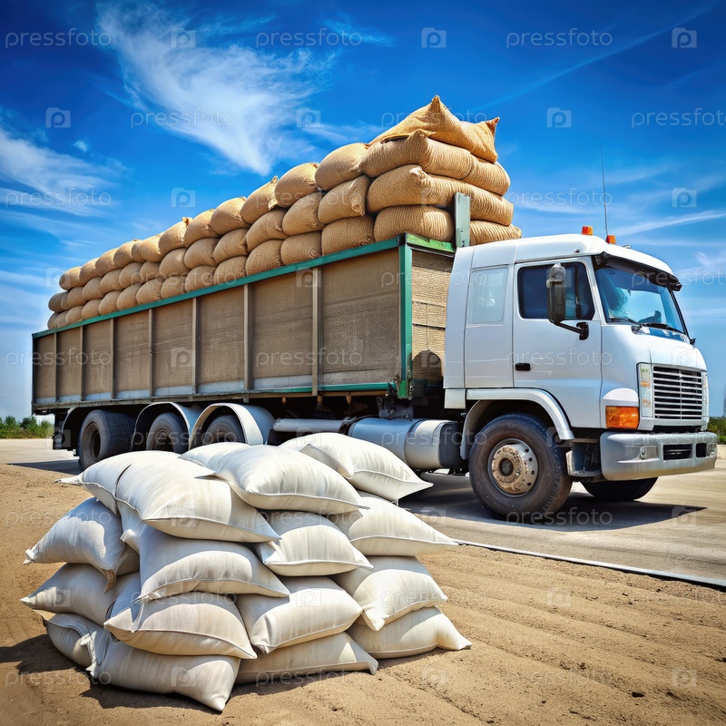 Белый полуторговый грузовик, загруженный мешками из бурлапа, припаркован на песчаной дороге