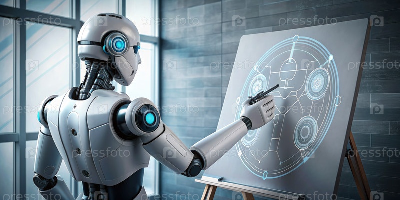 Художник-робот создает логотип компании в современной офисной обстановке