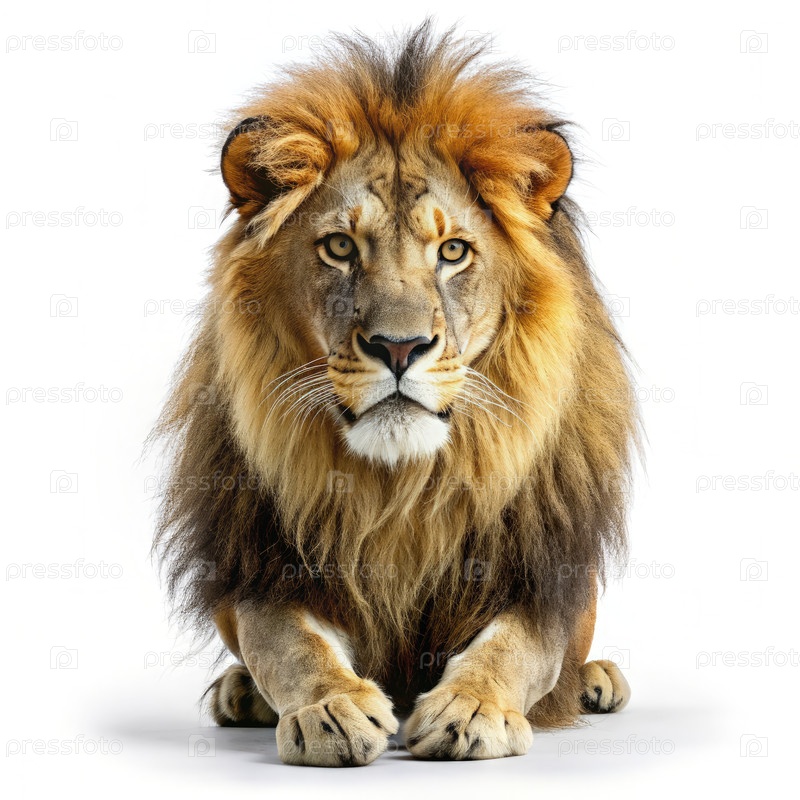 Величественный мужской лев позирует на белом фоне