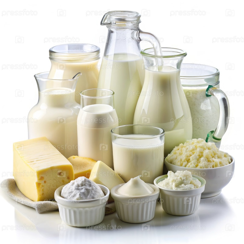 Разнообразные молочные продукты, включая молоко и сыр. генеративный ИИ
