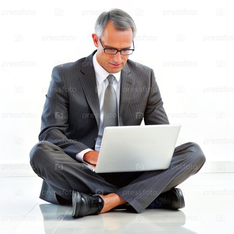 Бизнесмен работает на ноутбуке, сидя на полу. генеративный ИИ