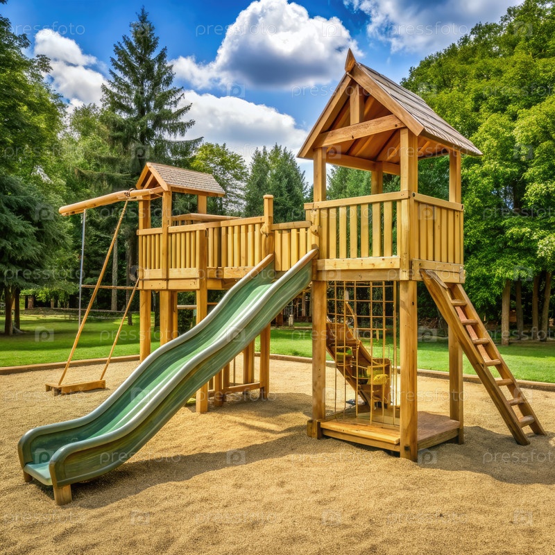 Структура деревянной игровой площадки с зеленой горкой и качелем. генеративный AI