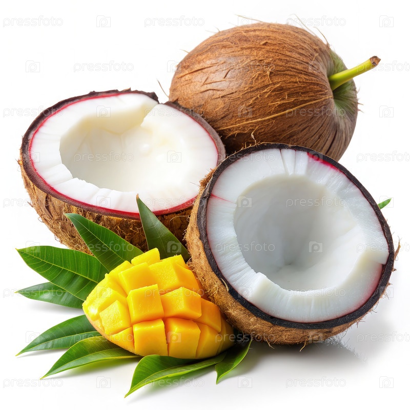 Кокосовые орехи и нарезанные манго на белом фоне