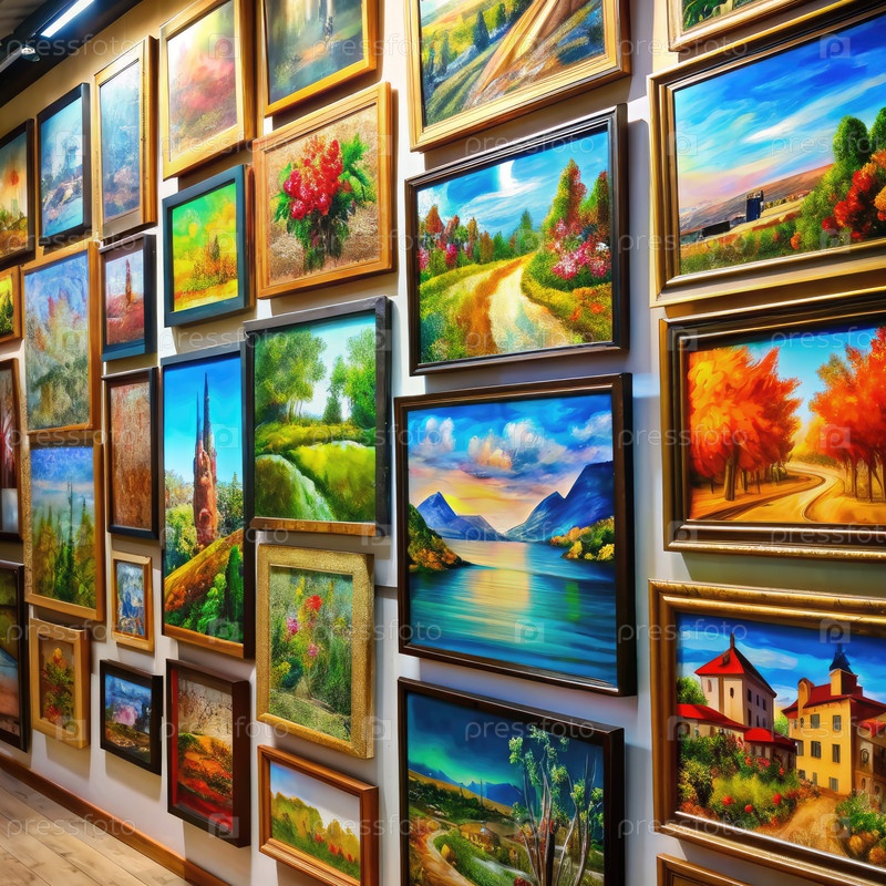 Стена обрамленных пейзажей в галерее. генеративный ИИ