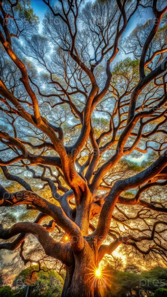Сложные ветви деревьев достигают к закату