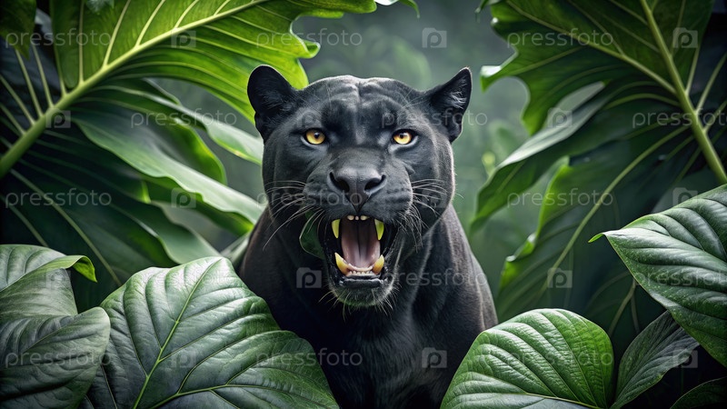 Черная пантера рычит сквозь пышные зеленые листья