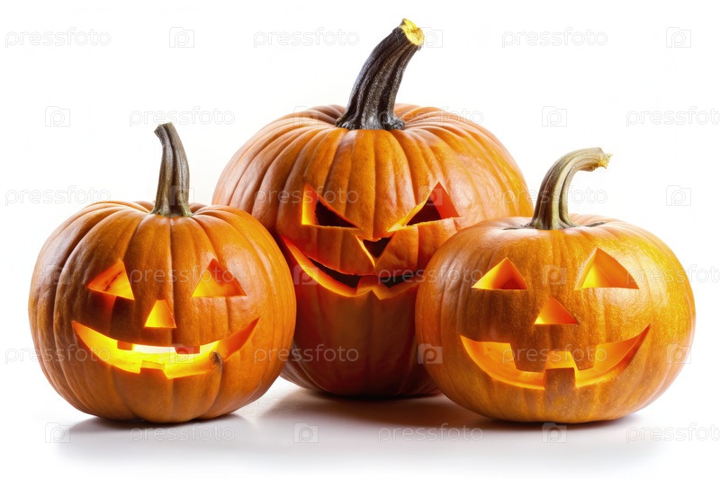 Три освещенных тыквы с фонарем, изолированные на белом фоне