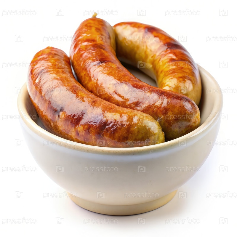 Три коричневых колбасы в белой миске на белом фоне