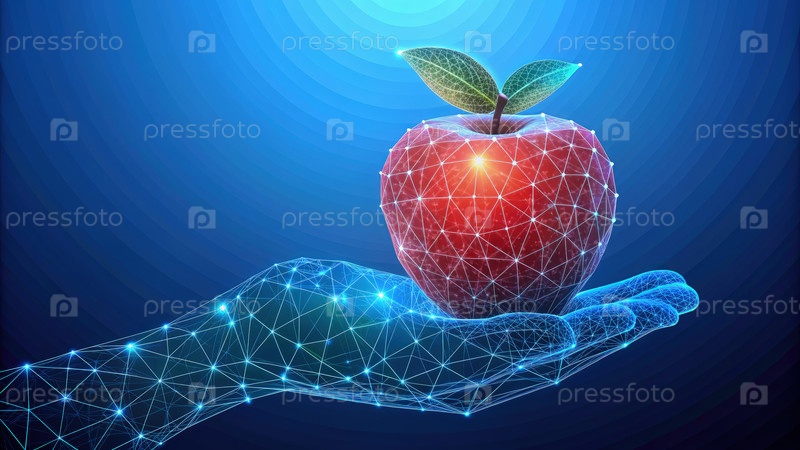 Низкая полипроволочная рама ручной работы, удерживающая красное яблоко с зелеными листьями. генеративный AI