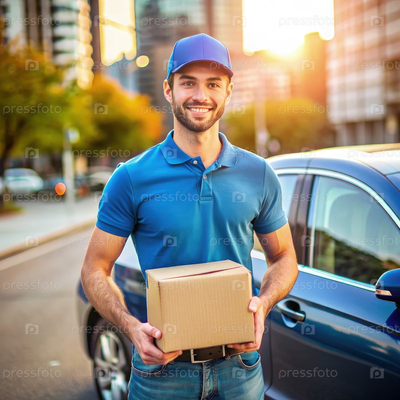 Доставщик держит коробку перед машиной. генеративный ИИ