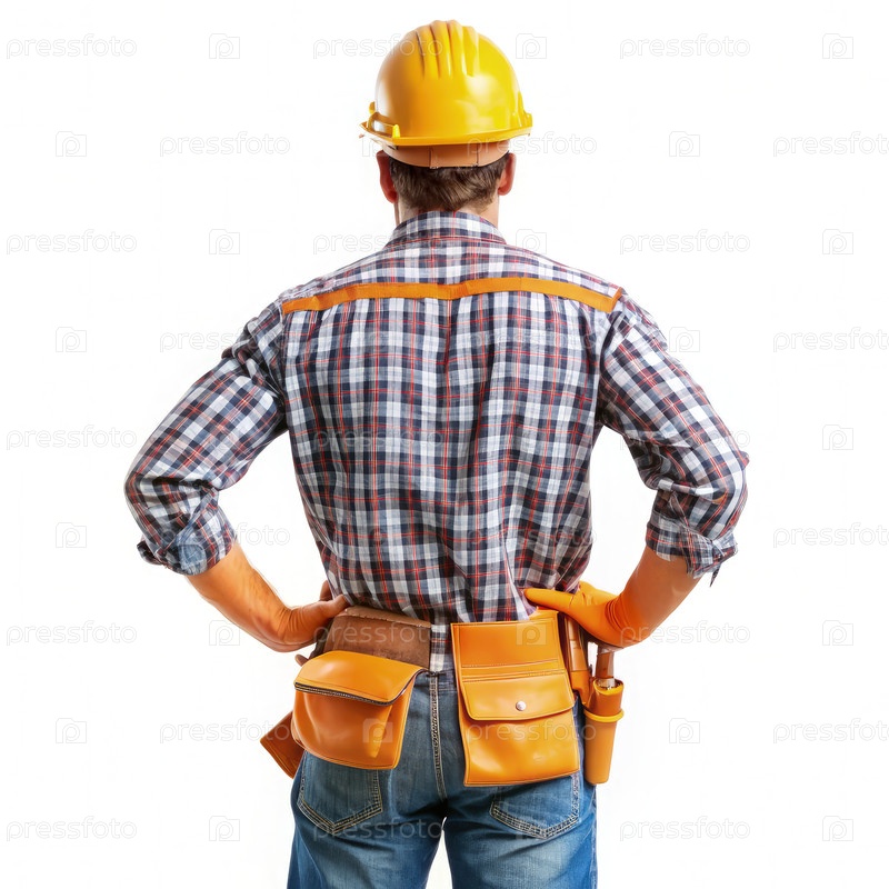 Строительный рабочий сталкивается с ремнем инструментов и жесткой шляпой