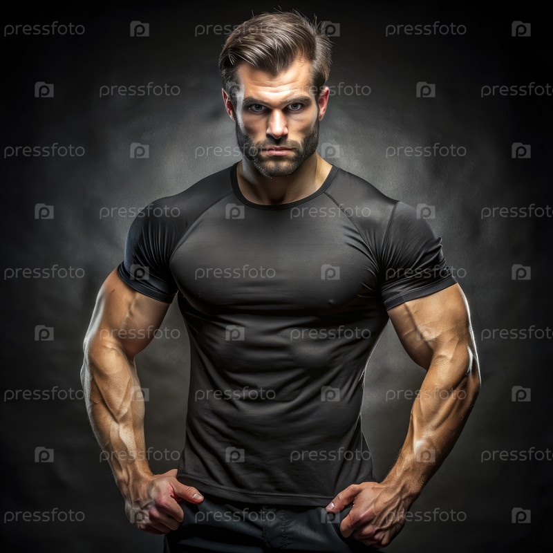 Мускульный мужчина в черной футболке позирует на темном фоне