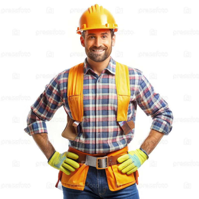 Строительный работник, носящий защитное снаряжение улыбается для камеры в студии