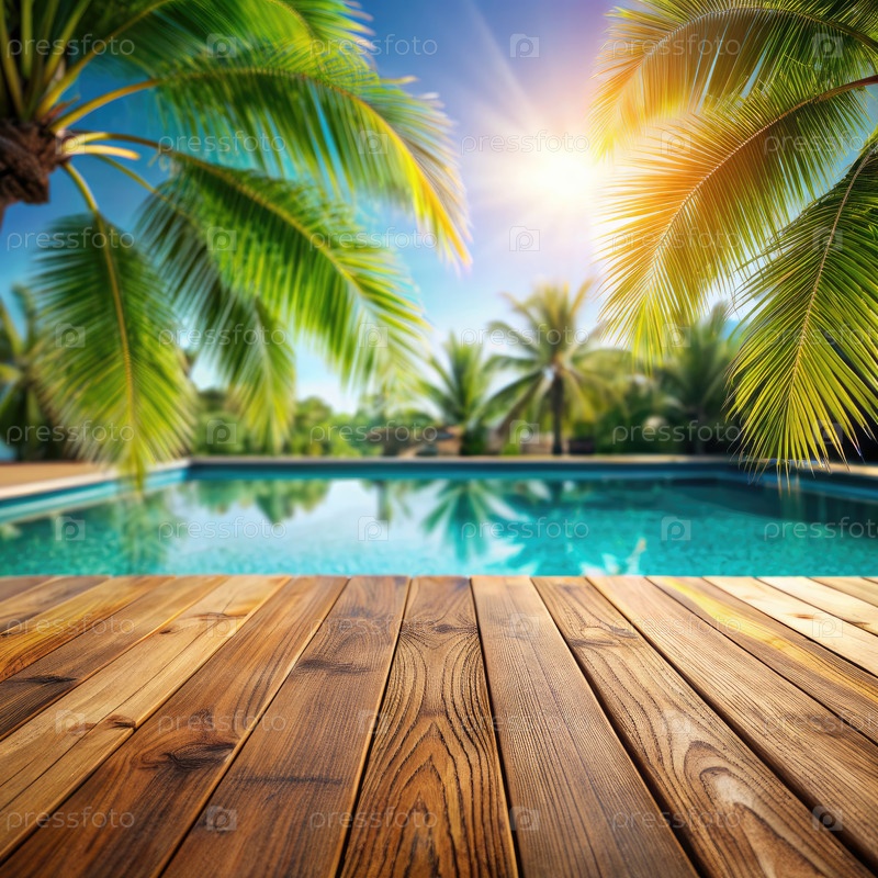 Деревянная палуба с видом на тропический бассейн и пальмы