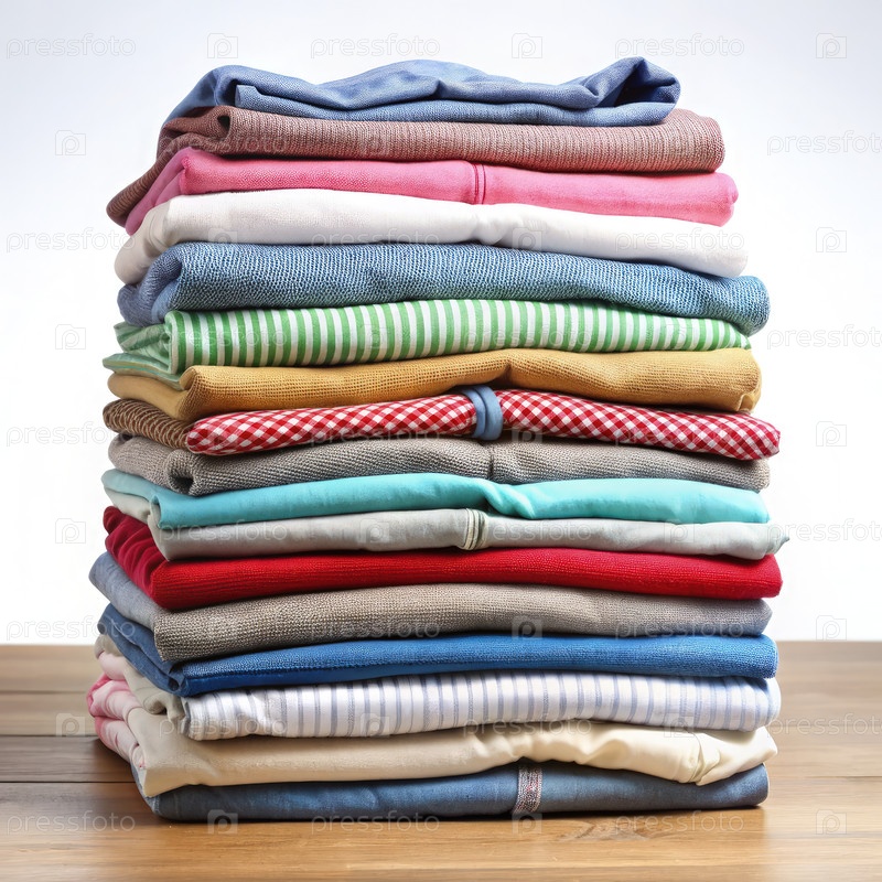 Аккуратно сложенная куча женской одежды на деревянной поверхности
